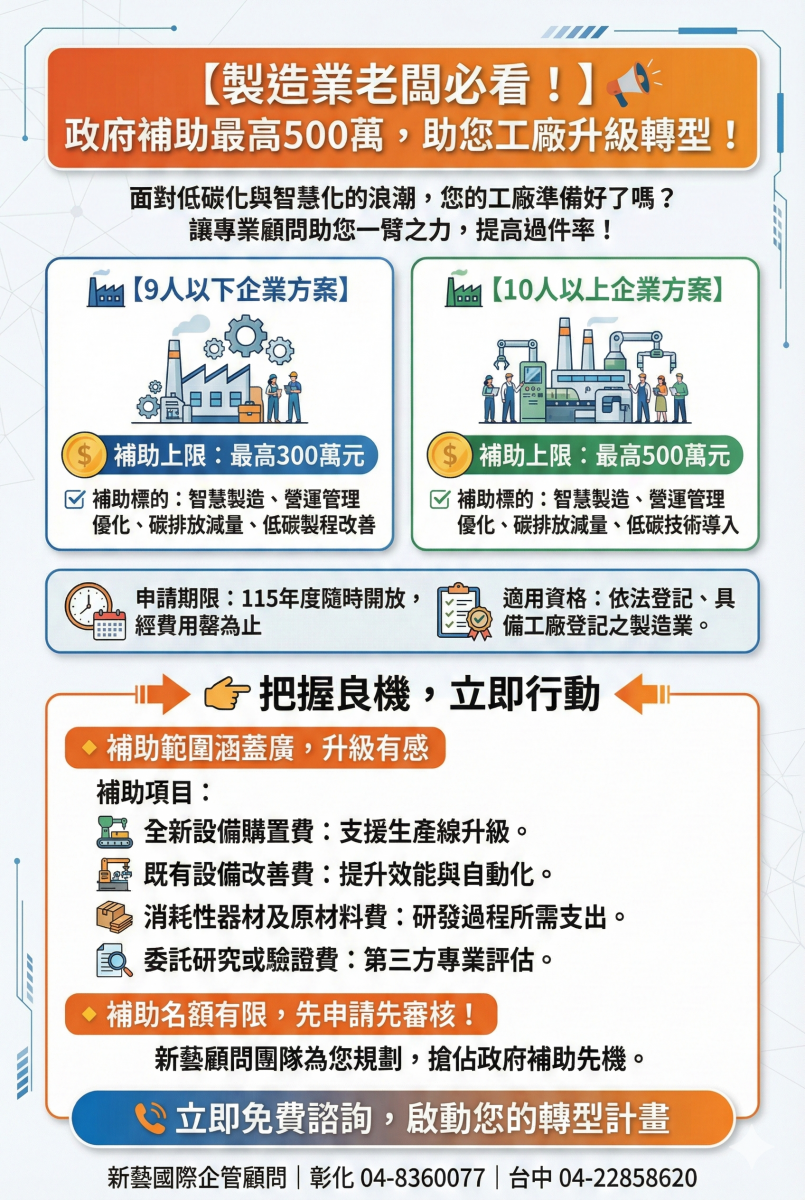 政府補助最高500萬,協助工廠升級轉型! 歡迎致電洽詢了解!